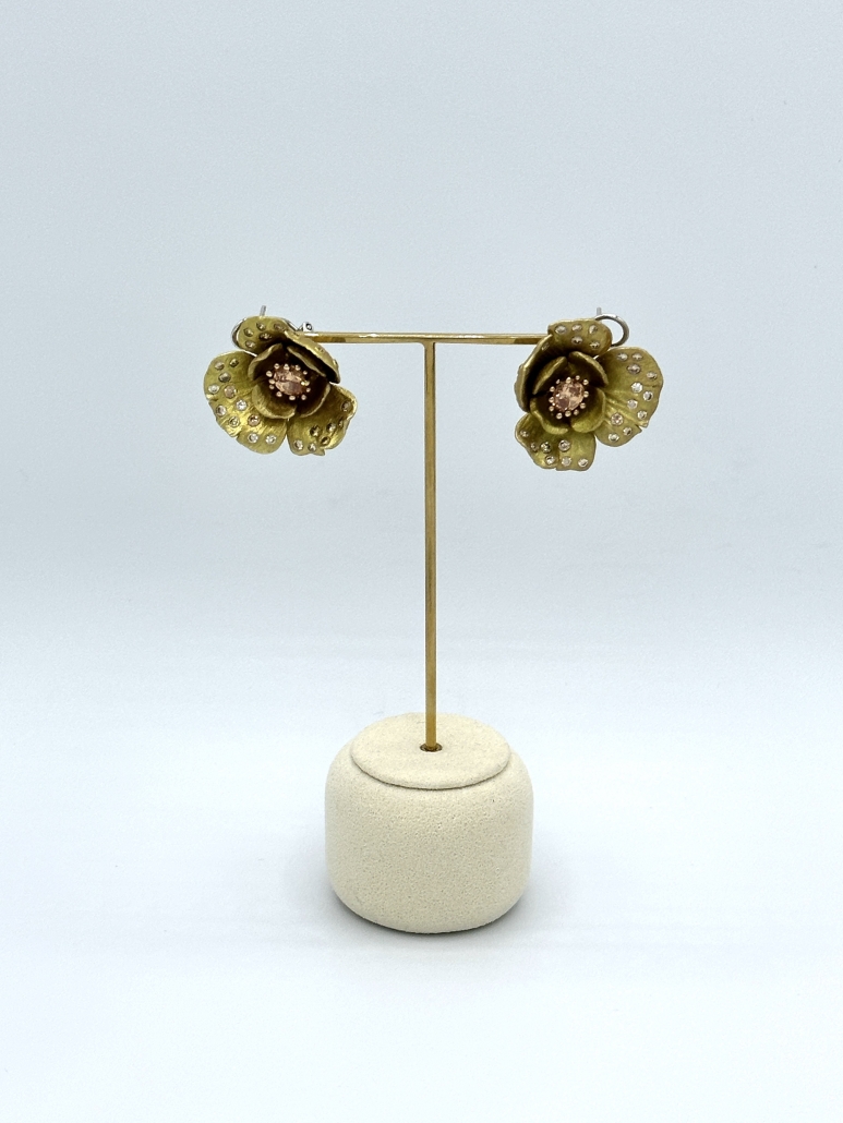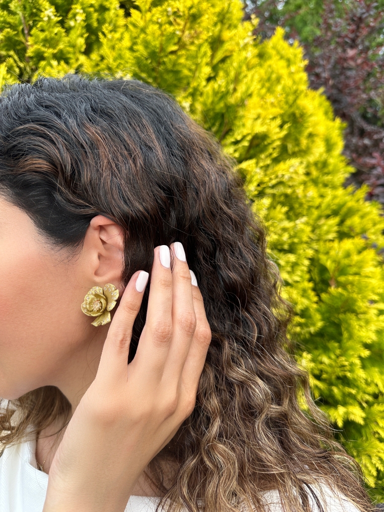 “Daisy Dazzle” is a pair of exquisite earrings that manifest elegance and charm. These earrings feature a delightful flower-shaped design. The mustard-yellow color of the petals adds a touch of vibrancy and warmth, reminiscent of sun-kissed daisies. With their versatile and eye-catching design, the “Daisy Dazzle” earrings can effortlessly transition from casual daywear to elegant evening ensembles.